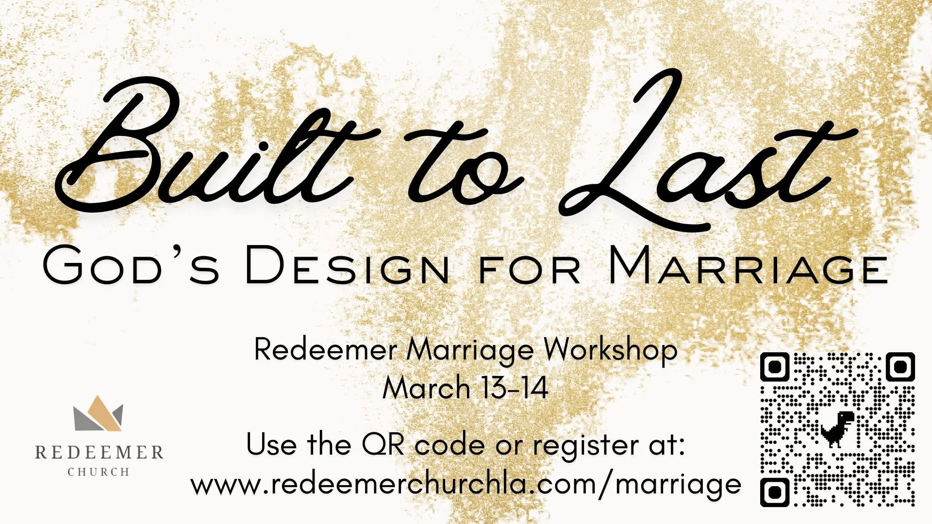 Join us for Built to Last, a marriage workshop hosted by Redeemer Church. This two-day event will help couples understand their roles, identify heart issues, and learn how the gospel transforms marriage. Through biblical teaching on idolatry, forgiveness, and communication, you will gain practical tools to grow in unity and love. Whether your marriage is strong or struggling, this workshop will encourage and equip you to walk together in Christ.